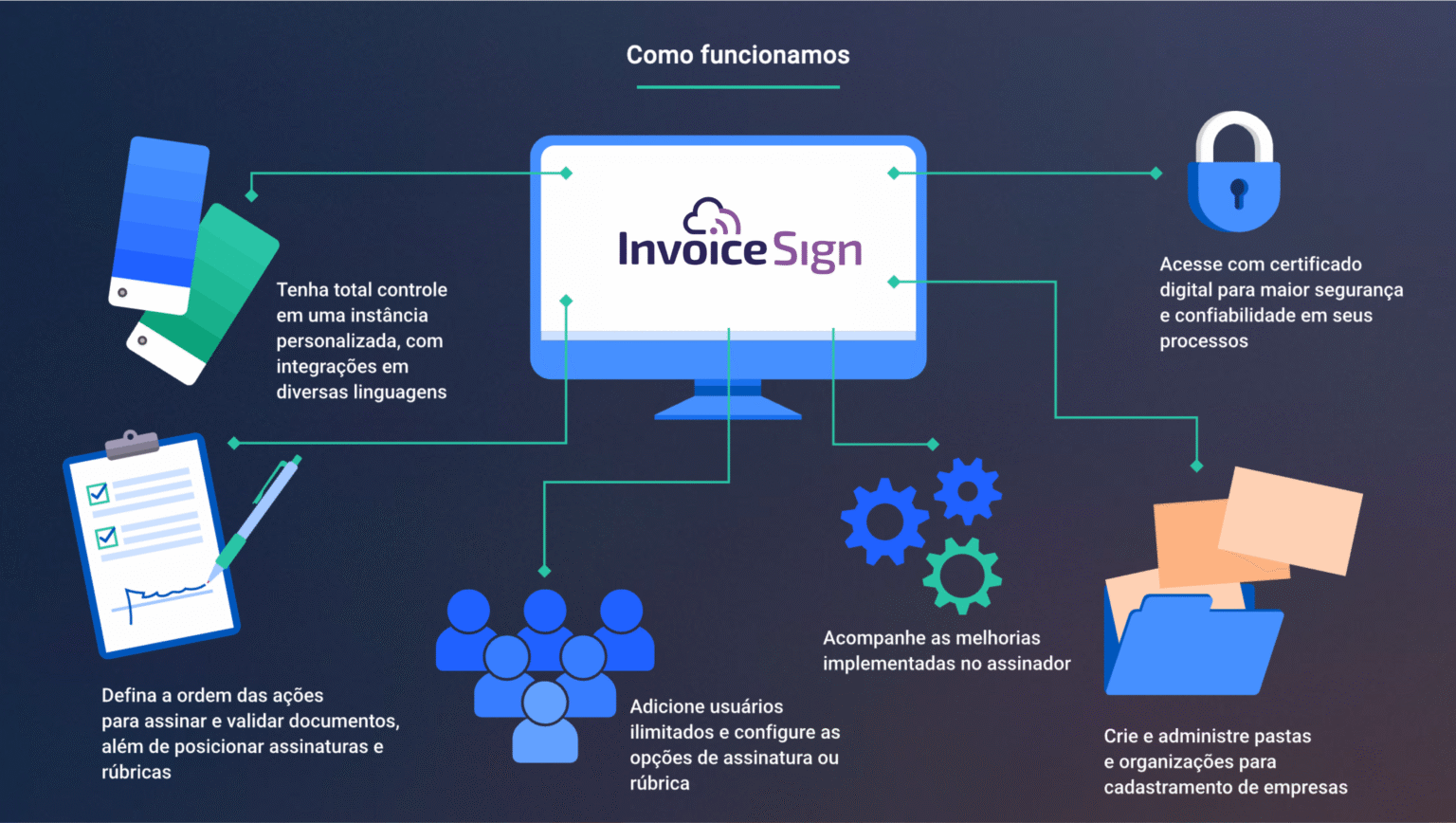 A InvoiceSign nasceu em 2019 para simplificar a assinatura de documentos digitais em PDF, trazendo praticidade e modernidade. Nossa missão é levar o Mundo Paperless para empresas, bancos e profissionais em todo o Brasil, tornando a assinatura de documentos rápida, transparente e segura. Descubra em poucos segundos como é fácil assinar, gerenciar e validar documentos digitalmente, com total segurança jurídica e praticidade.